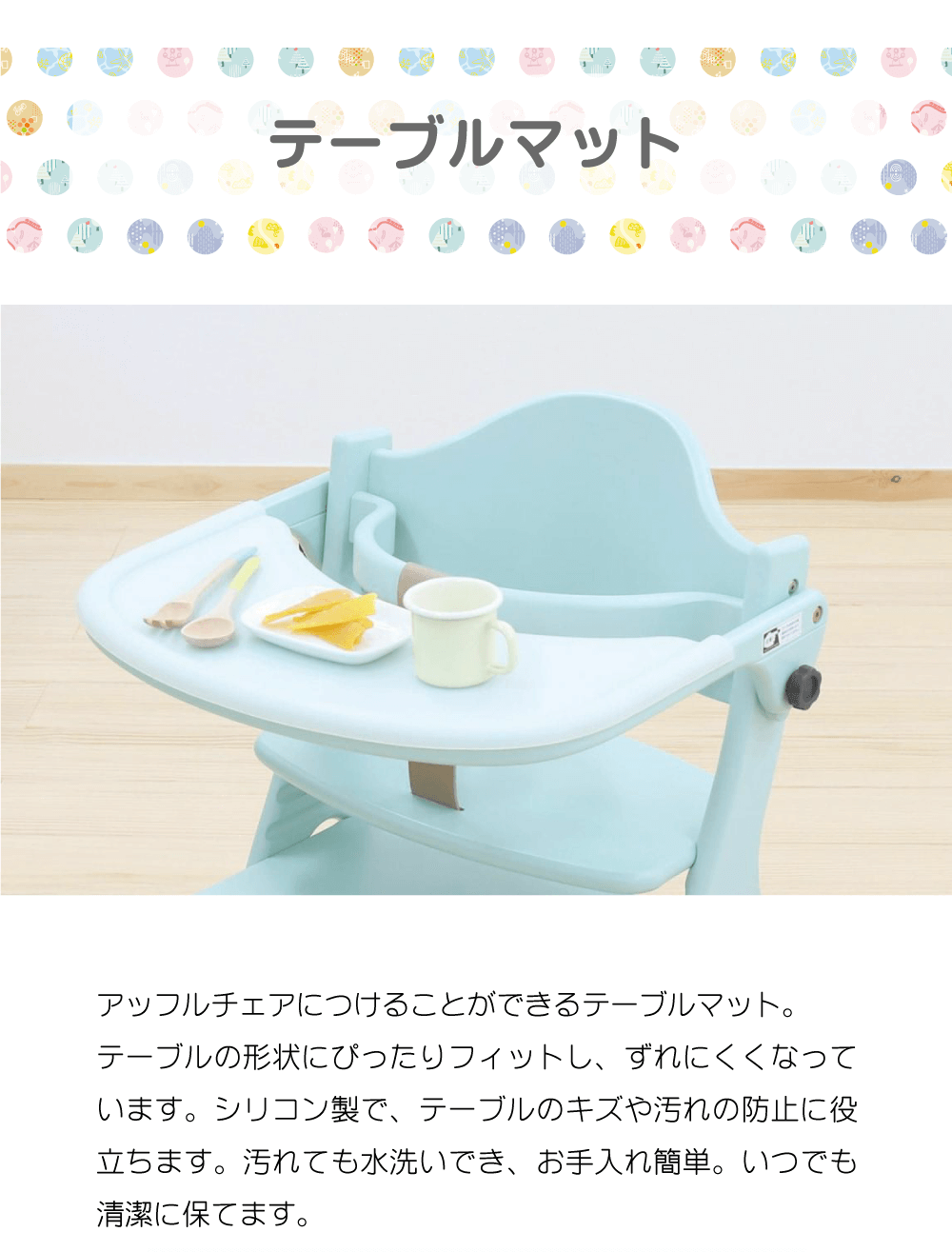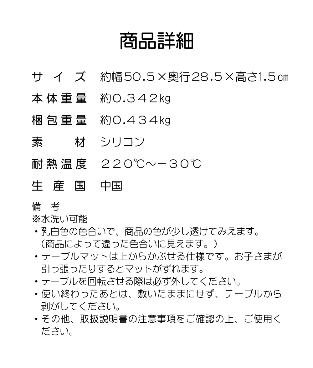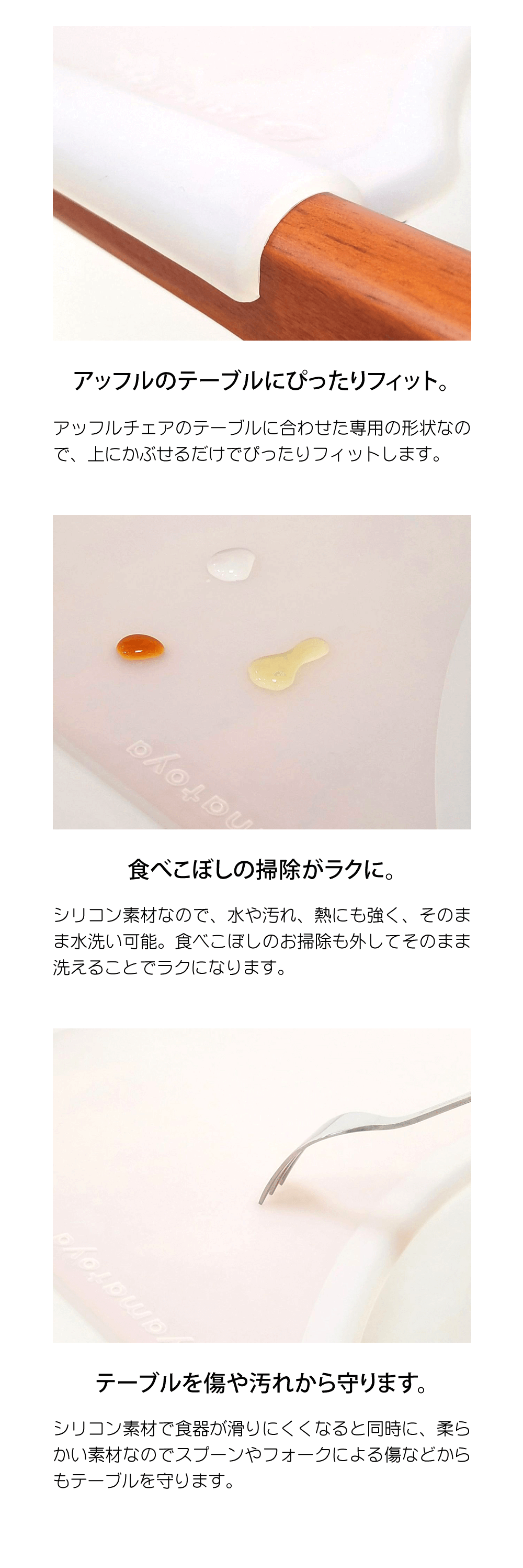 アッフル対応マテルナチェアとアッフルチェアにつけることができるテーブルマット。テーブルの形状にぴったりフィットし、ずれにくくなっています。シリコン製で、テーブルのキズや汚れの防止に役立ちます。汚れても水洗いでき、お手入れ簡単。いつでも清潔に保てます。サイズ 幅約50 × 奥行き28 × 高さ1.5cm素材 シリコン生産国 中国